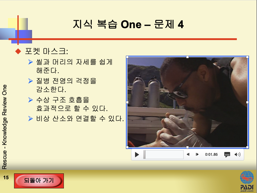이전 포켓마스크 장점중 하나가 '산소가 첨가된 공기를 공급하기 위해 포켓마스크에 연결가능' 이라고 배웠습니다. 이때 연결되는 산소는 레스큐교재 26페이지에서 설명하는 응급산소공급 시스템입니다. 이러한 시스템을 보다 상세하게 그리고 정확하게 알고 싶으시면 이머전시 옥시즌 프로바이더(Emergency Oxygen Provider) 라는 과정을 PADI에서 제공하고 있습니다. 본 과정은 꼭 다이버가 아니더라도 교육에 참여할 수 있습니다. 보다 상세사항은 PADI 앱을 통해 확인하실 수 있습니다.