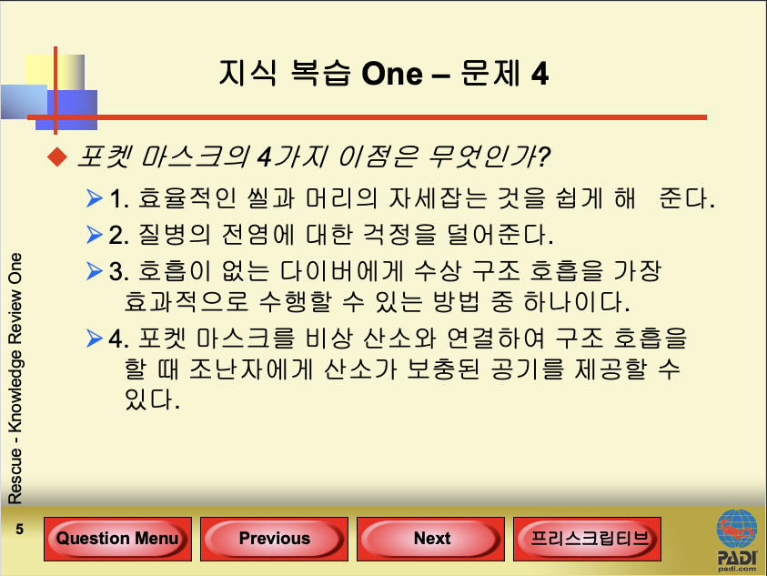 지금까지 했었던 포켓마스크 사용법 또는 PADI 코스중 이머전시 옥시즌 프로바이더(Emergency Oxygen Provider) 대하여 질문이 있으시면 해주시길 바랍니다.