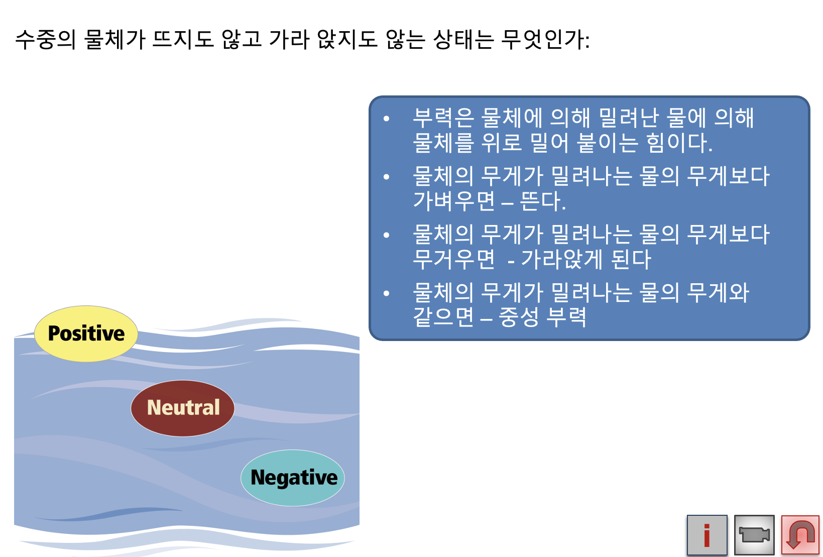 그림 위에 있는 양성부력, 음성부력, 중성부력을 설명하는 글을 한번씩 읽어보시길 바랍니다.